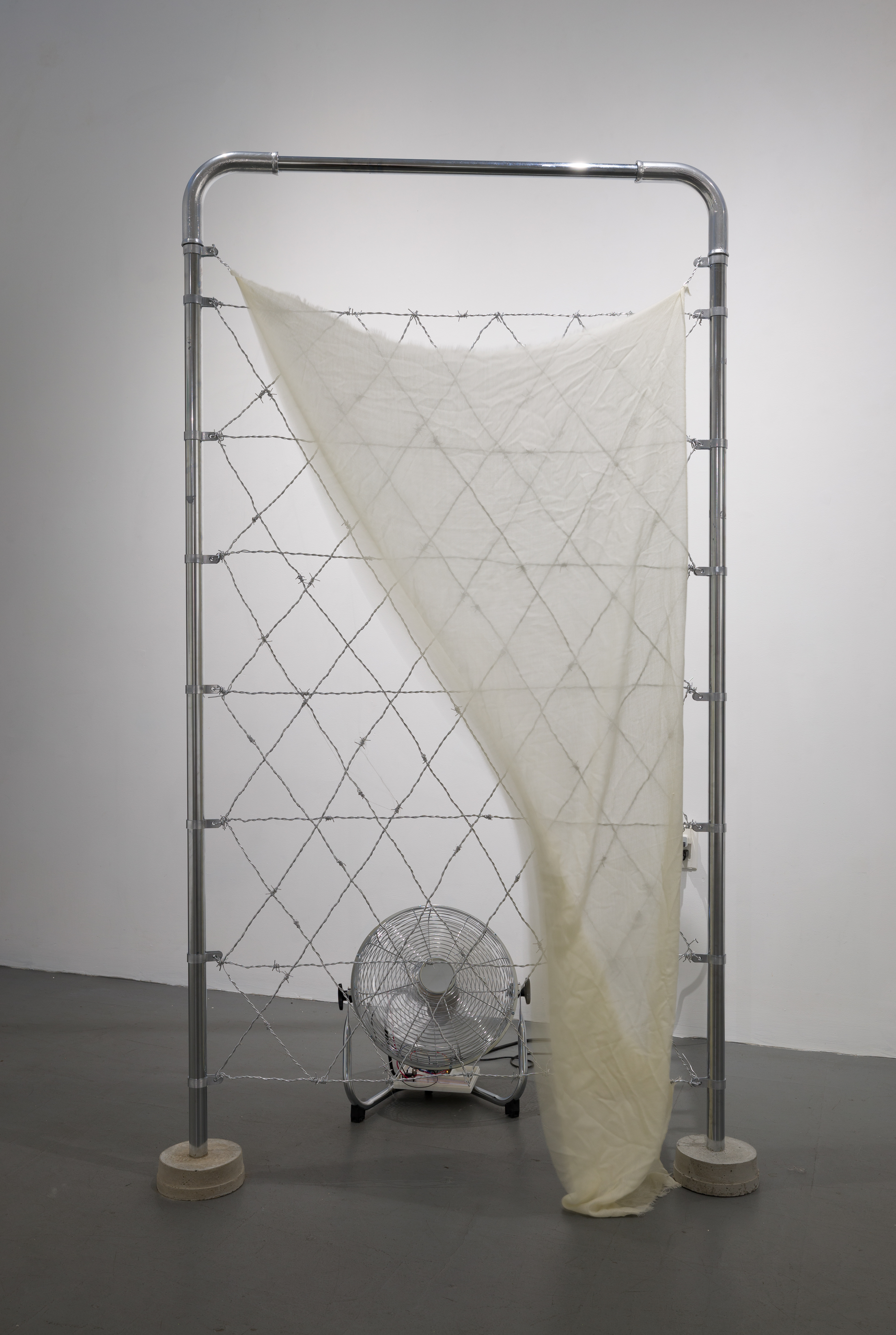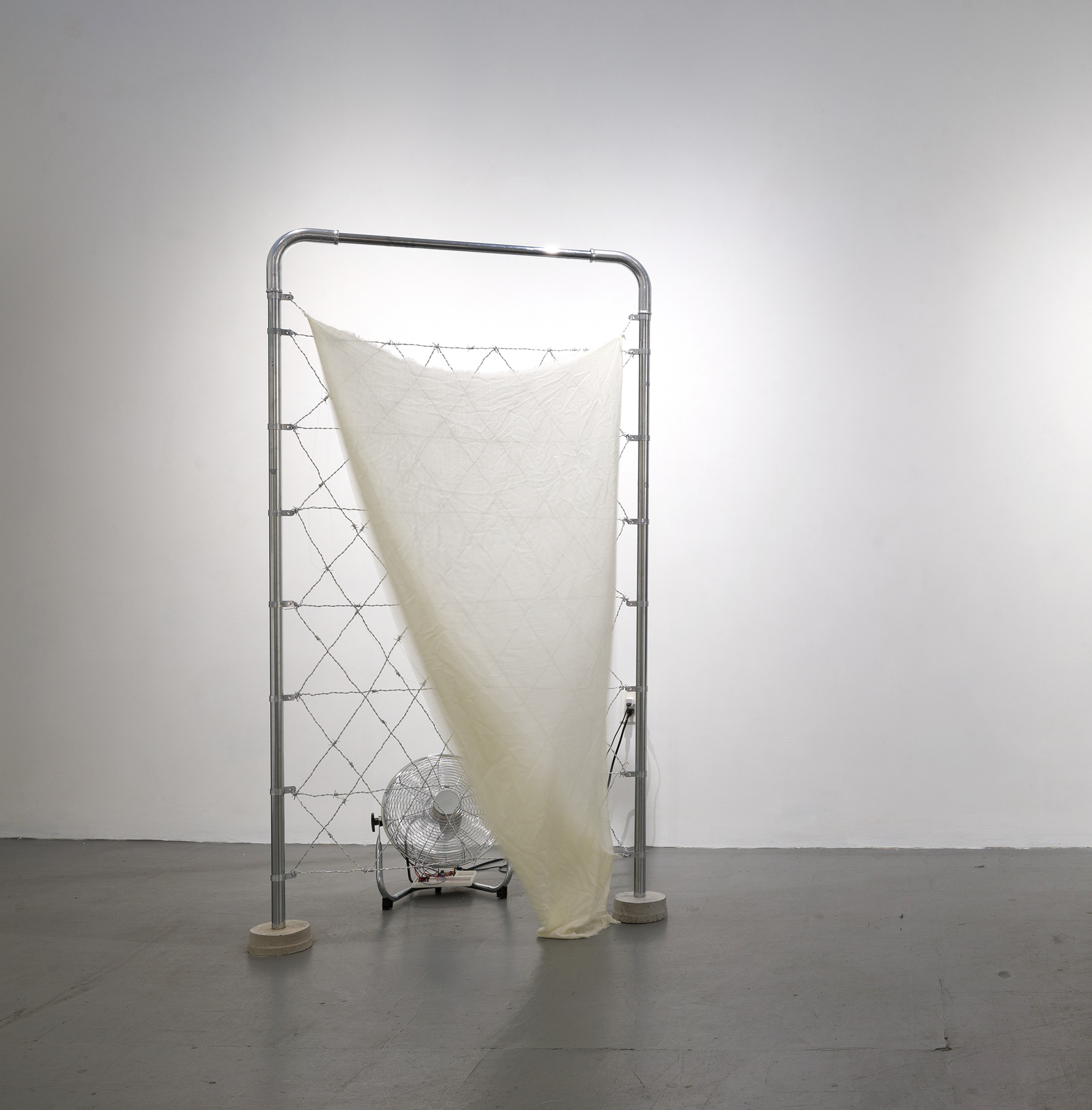 Medium: Stainless Steel, Aluminum Wire, PLA Plastic, Concrete, Fan, Arduino and Cashmere Fabric Date: 2024 Dimensions: 40 x 40 x 80 in